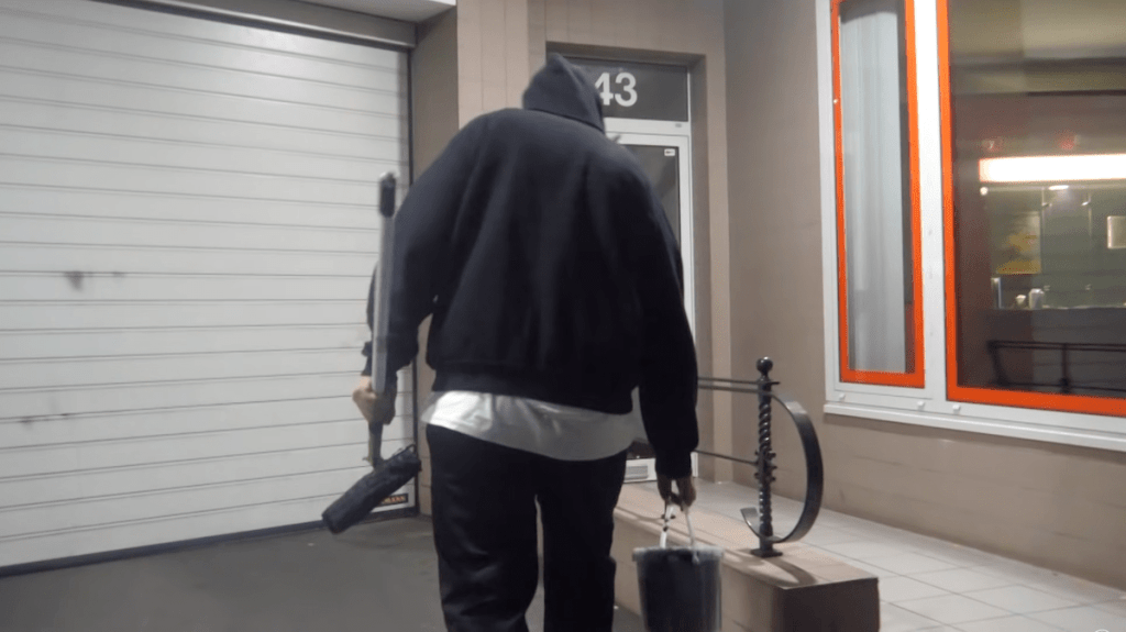 Kommt er abends zu mir rüber, schwarze Jacke, schwarze HoseHe comes over to me in the evening, black jacket, black pants